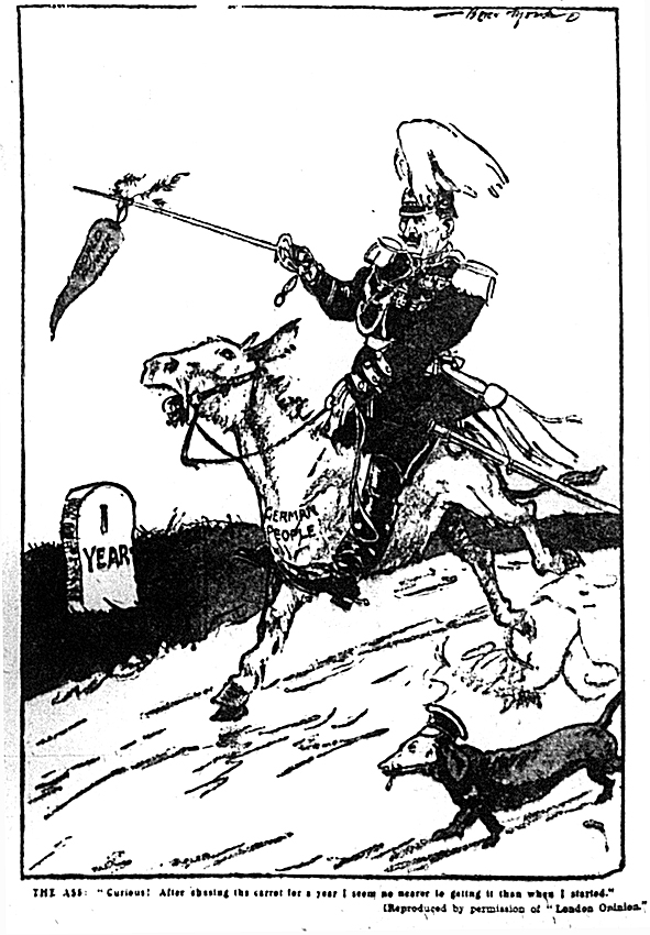 The subject of the cartoon was the Kaiser being shown urging on the German donkey by means of a carrot (world domination) fixed to the end of a sword. The precious couple have reached the first milestone of their journey, said the Telegraph, and the ass is beginning to wonder why he is no nearer to the coveted carrot than he was 12 months ago.