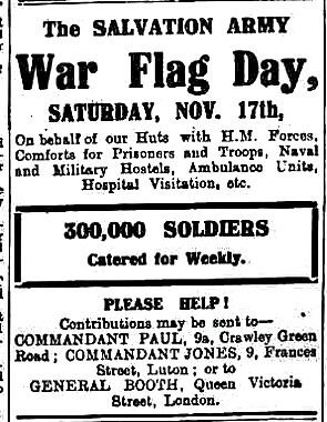 In order that workers especially might have an opportunity of showing their appreciation it was agree to take steps to organise a flag day, but the reply of the Mayor, through the Town Clerk, was that he could not assent to their holding a flag day on November 10th, as it had been the practice not to have more than one flag day each month, and the Salvation Army Day [advert, right] would be held in the middle of November, and there were several other days for which arrangements had still to be made in response to long-standing appeals.