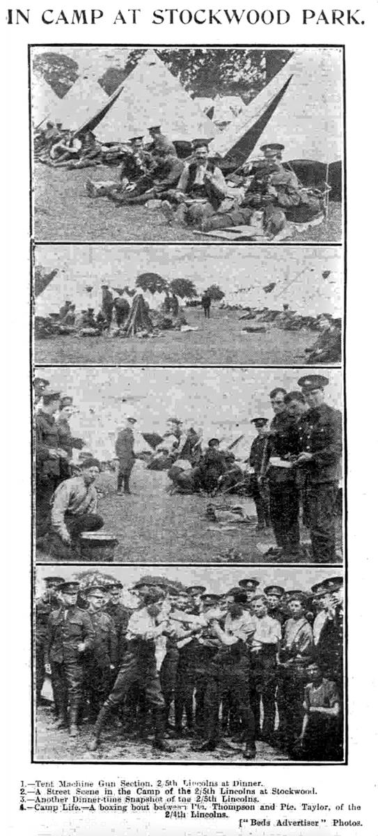 Transferred from their comfortable billets in the town to the beautiful surroundings of the Stockwood desmesne, the first experiences of camp life by the men of the Lincoln and Leicester Brigade on Friday and Saturday last week were not the most agreeable.