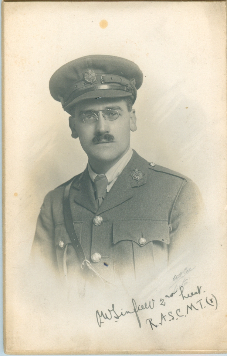 His records show that he joined as a Private (none commissioned) soldier, but does not record his promotion to 2nd Lieutenant in the Royal Army Service Corps, Motorised Transit section. This part of his army record is missing, presumed destroyed in the WW2 bombing of the war office.