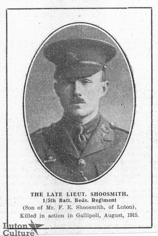 Lieutenant Shoosmith was the son of Francis Shoosmith a Straw Hat Manufacturer of Hart Hill, Luton. He was killed on 21st August 1915, aged 21.