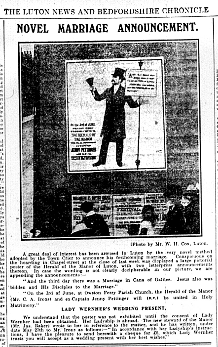 Charles Irons was born at Cockernhoe on August 20th, 1863. His father, who had farmed 1,000 acres of the Putteridge Estate, later became Luton's Town Crier for around 10 years before his death. It was agreed that 19-year-old Charles could succeed him in a post that also included being billposter, bellman and Pound Warden (locking up stray animals).