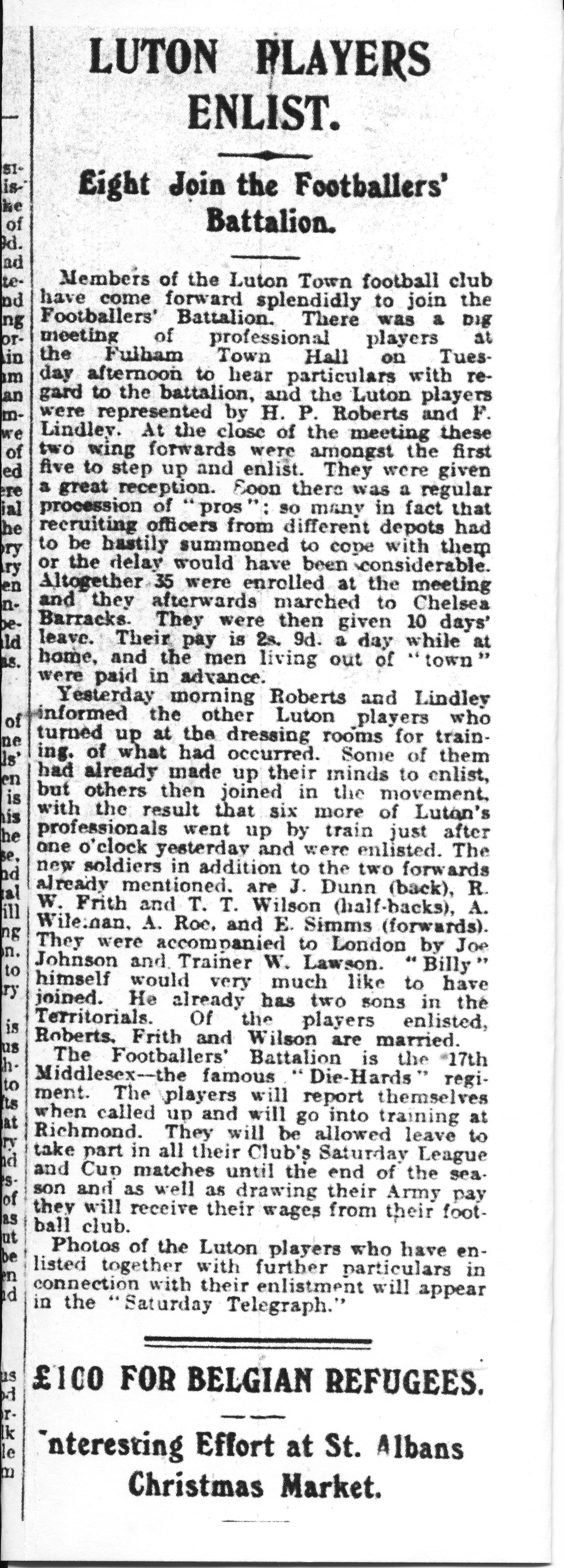 Frank Lindley was a professional footballer at Luton Town FC when he enlisted in the Footballers Battalion of the Middlesex Regiment at a public meeting at Fulham Town Hall on 15th December 1914.