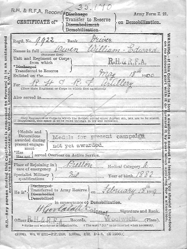 He is Transferred to Army reserve on February 18th 1919 in consequence of demobilization