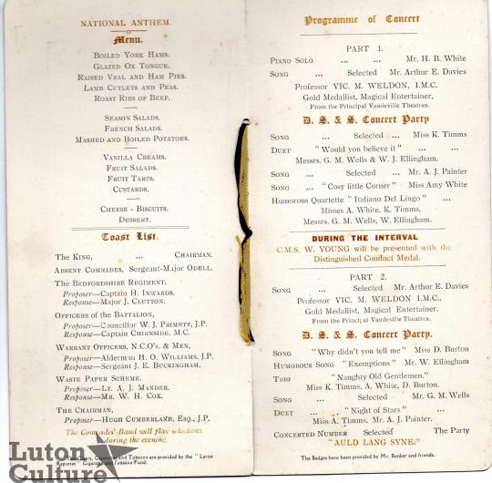 The programme of events detailing Menu, Toast List and Concert and Performers