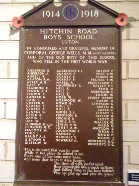 Hitchin Road Boys' School was created in 1883 by the Luton School Board. The memorial lists the names of one master and seventy four old boys "who fell in the First World War". When the school closed in 1967 it was donated to Luton Museum Service and is now on display at Stockwood Discovery Centre.