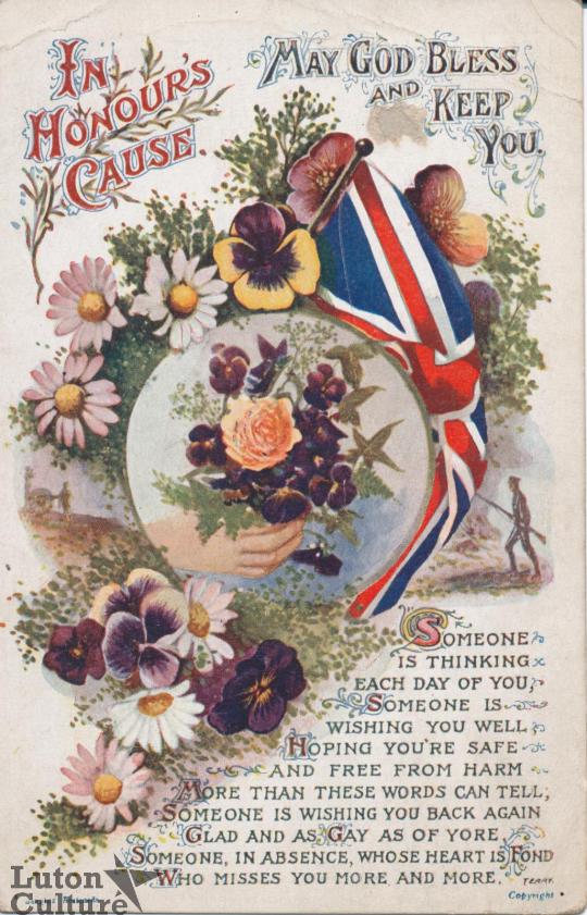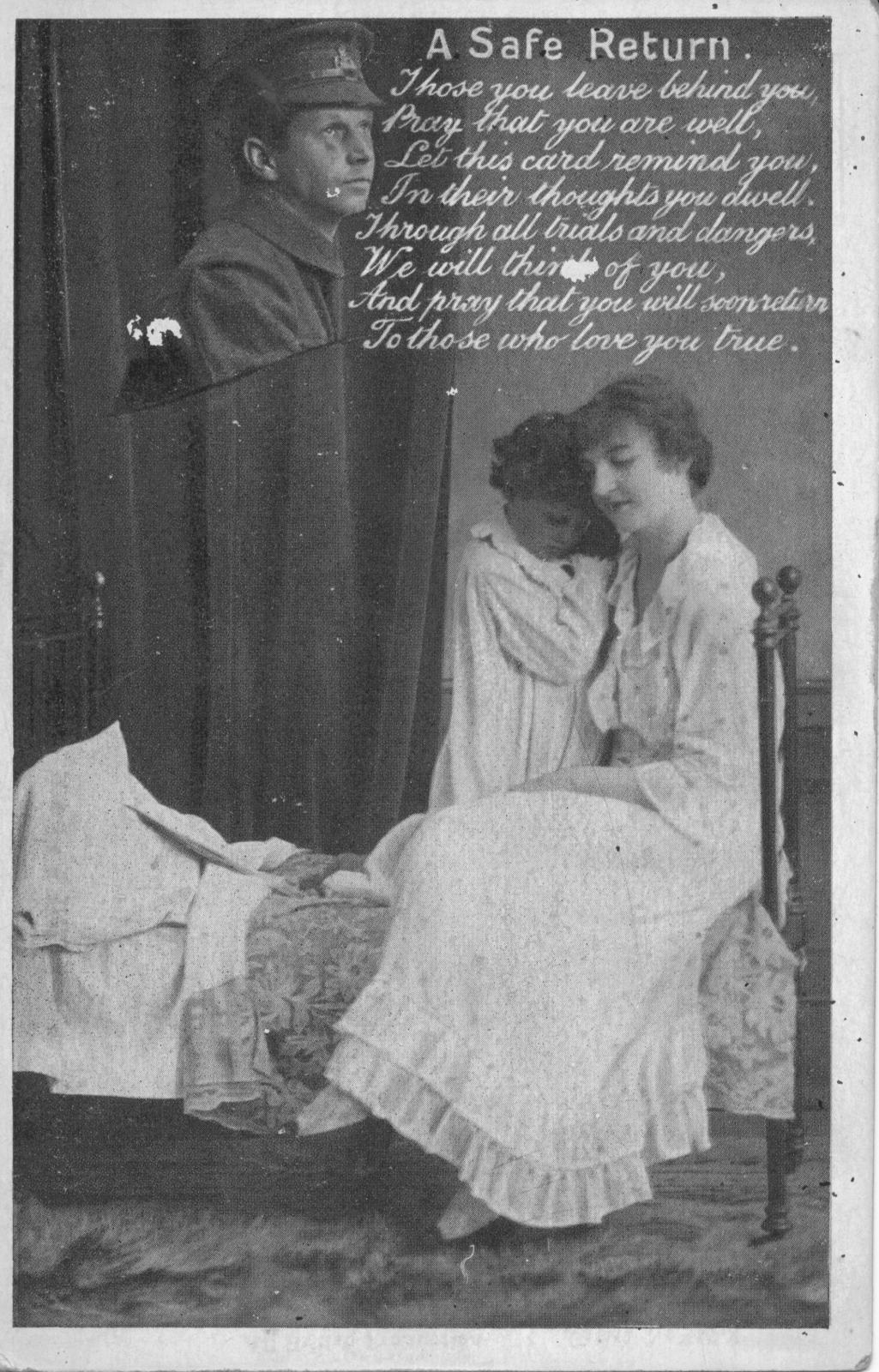 During the Great War, sending, receiving and collecting picture postcards was hugely popular. Many commercial outlets produced postcards with patriotic messages. Images  of soldiers and their families with sentimental verses were also common. These cards were eagerly bought by the public to send to relatives on active service.