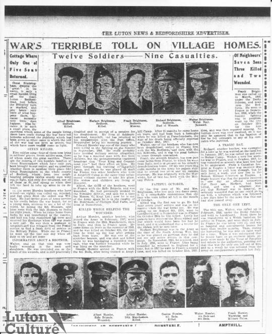 This report from the Luton News 1st January 1920 tells the tragic story of two neighbouring families from the hamlet of Great Bramingham who lost seven sons between them.