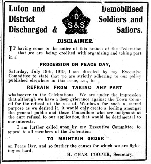 Yours faithfully, H. C. Cooper, on behalf of Luton and District Discharged Sailors and Soldiers Association.