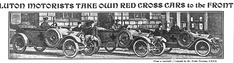 Without any ceremony, three Luton men left the town on April 19th, 1915, on an errand of mercy to the war front. Mr Arthur Brown, Mr C. R. Clay and Mr Rupert Plummer were bound for the battlefield, each in charge of a new Red Cross car to be used to transport wounded soldiers from as near to the firing line as it is possible for the cars to be taken and from there to a hospital train.