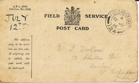 Field Service Postcards were used by soldiers on active service to send speedy messages home without any need for censoring by their officers. Their purpose was to reassure their loved ones that they were alive and well and to confirm that letters and parcels from home were getting through to the Front. The soldier was allowed to delete as appropriate from a selection of pre-printed sentences. If anything other than a date and signature were added the card would be destroyed.
