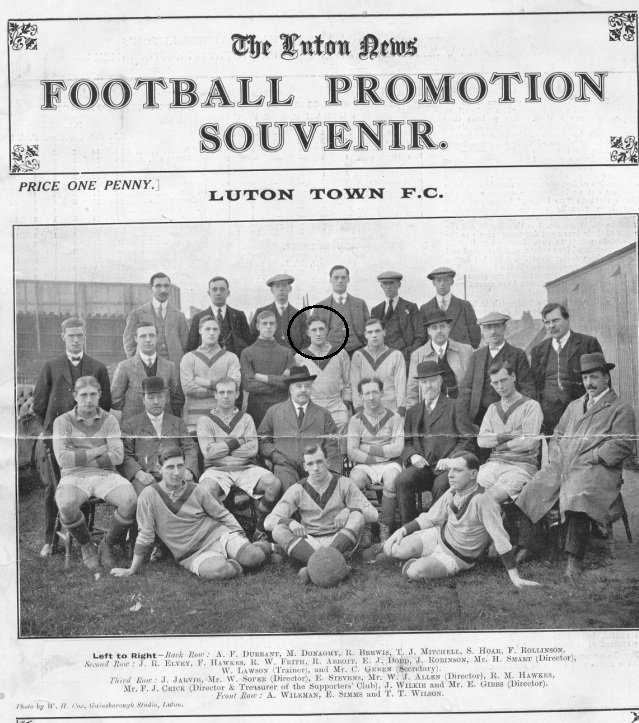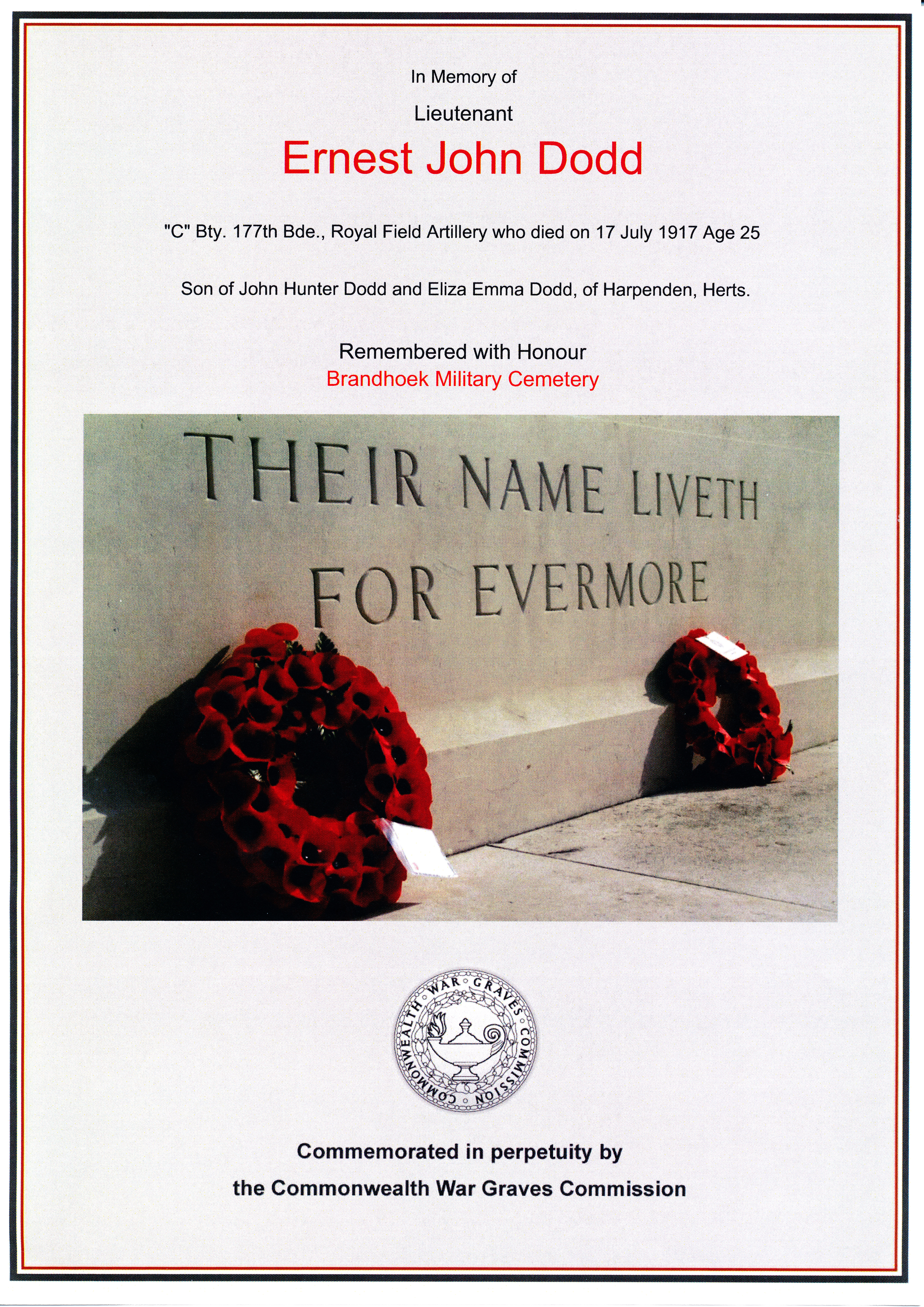 Ernest J Dodd of East Common, Harpenden was a pre-war amateur player for Luton Town FC. He was killed in action on 17th July 1917, aged 25 whilst serving with the Royal Field Artillery in Belgium.