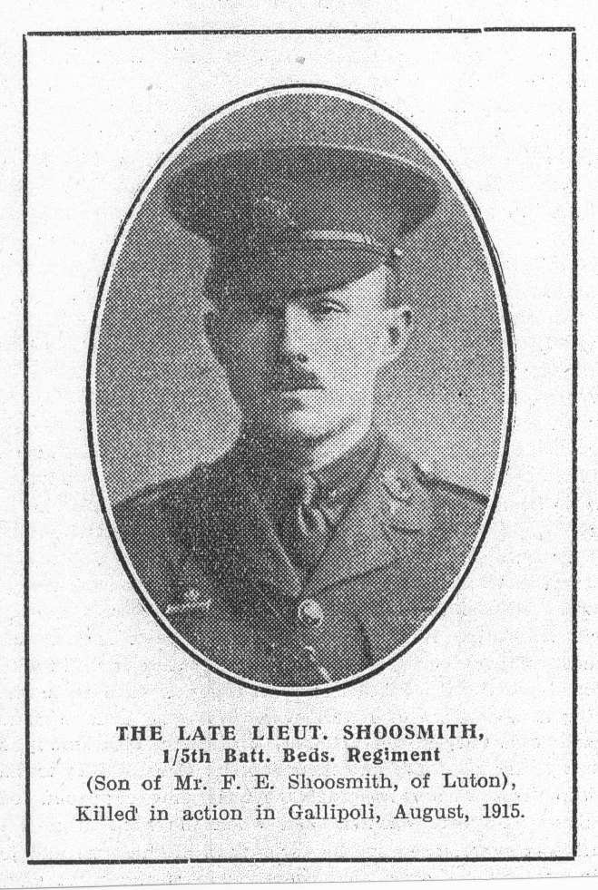Lieutenant Shoosmith was the son of Francis Shoosmith a Straw Hat Manufacturer of Hart Hill, Luton. He was killed on 21st August 1915, aged 21.