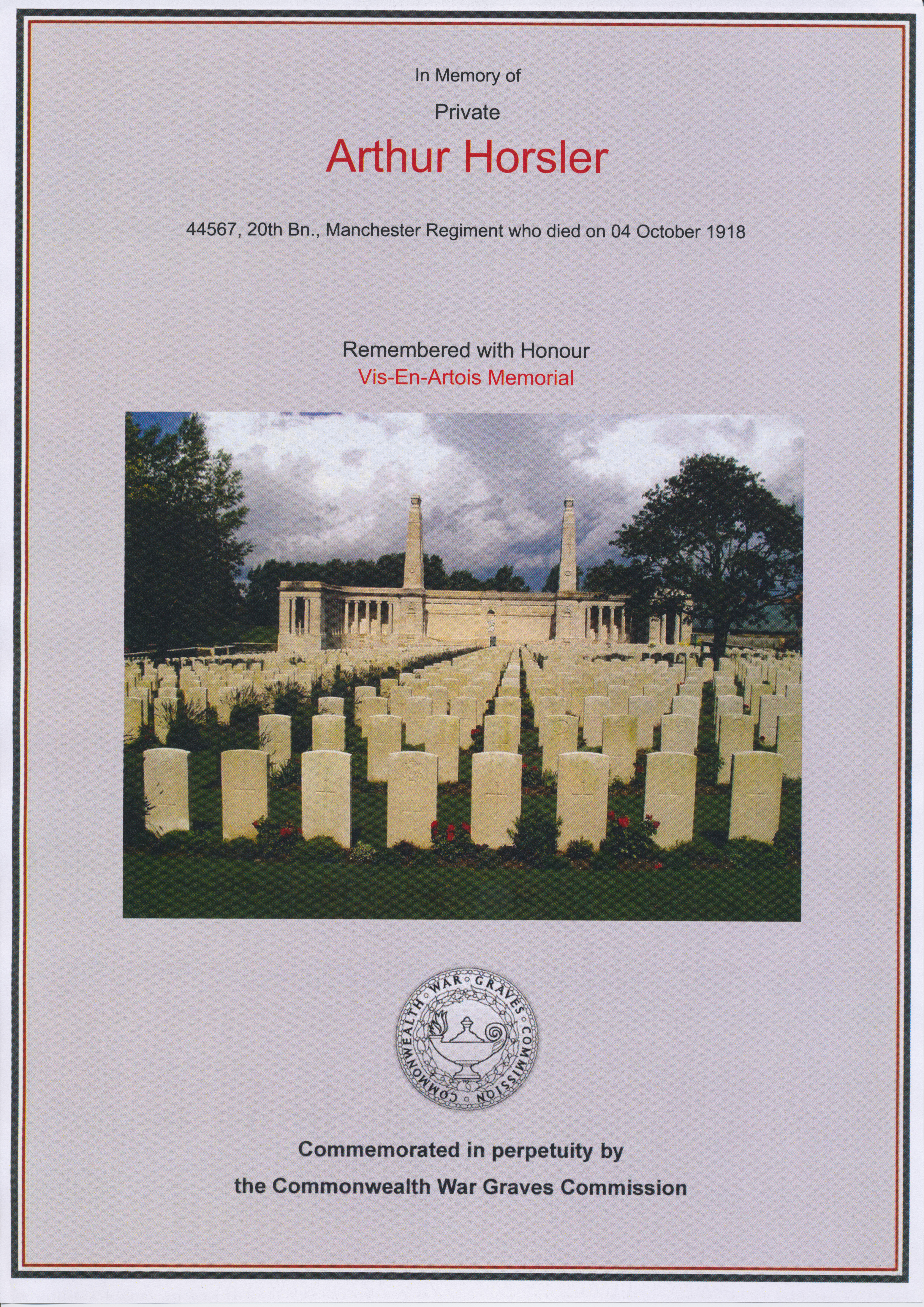 Arthur joined the army in February 1917 and served in France and Italy with the 20th Manchesters. He returned to France in July 1918 and was killed on 4th October 1918 whilst acting as a stretcher bearer. He has no known grave and is commemorated on the Vis en Artois memorial. His name also appears on the Sundon Village memorial in Bedfordshire.