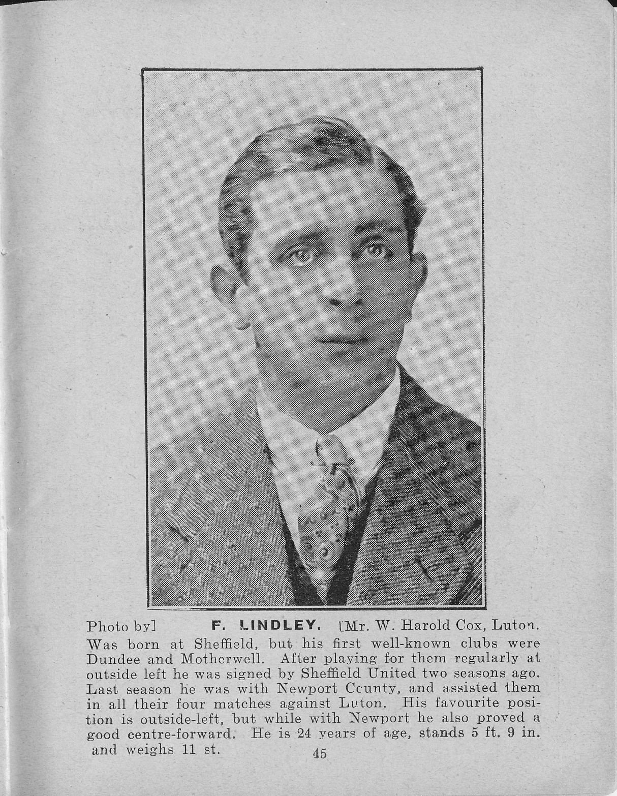 Lindley was a wing - forward ( 5ft 9 inches,185 lbs, chest 39 inches) who joined Luton for the 1914-15 season. He did not return to play for Luton in 1919-20.