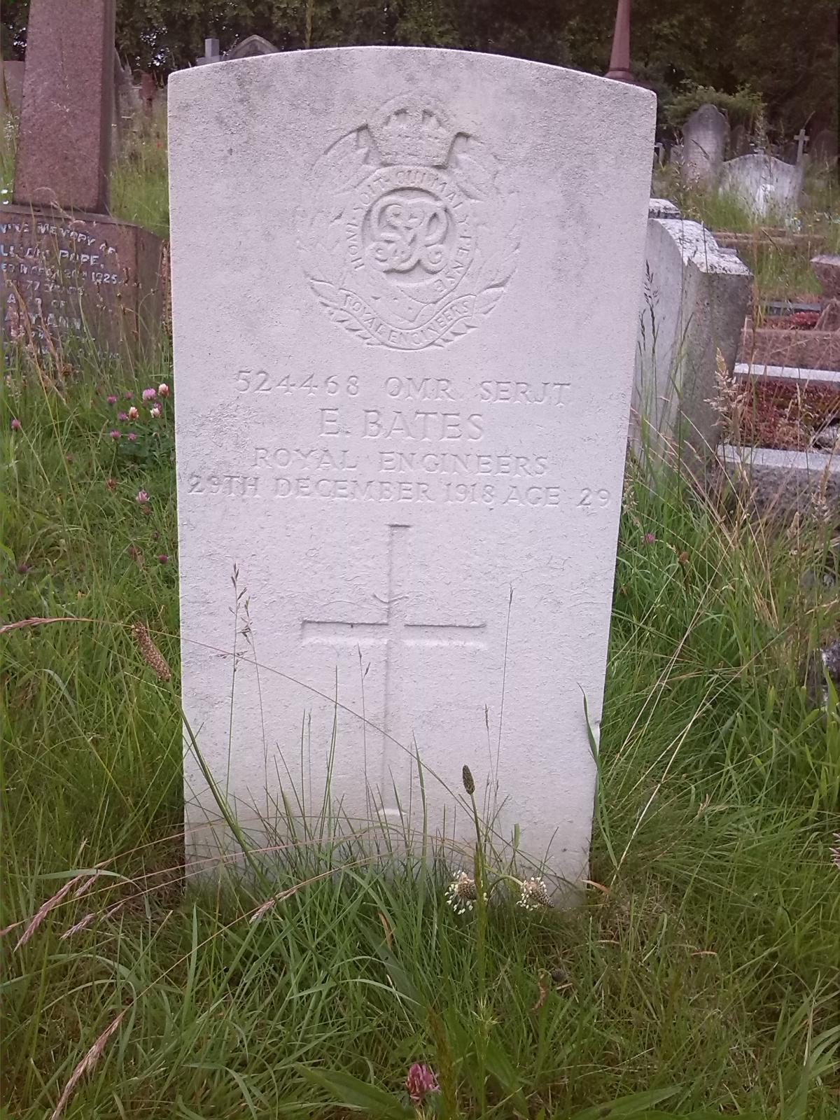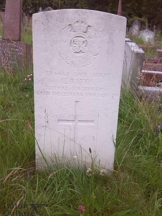 Ernest Bates, aged 29, of 59 Cromwell Road, Luton, died at Wardown Park V.A.D. Hospital at 2.25pm on December 29th, 1918, from double pneumonia and heart failure while on 14 days leave from France. He had been admitted to the hospital on December 21st with influenza, and is buried at Rothesay Road Cemetery Luton.