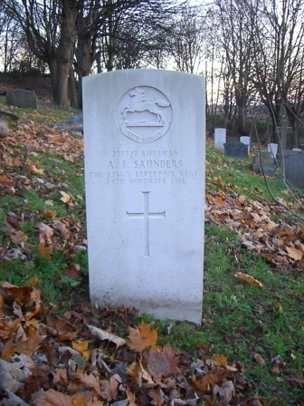 Pte Albert Edgar Saunders, 235327, 18th Battalion The King's (Liverpool Regiment), died in King George's Hospital, London, on November 24th, 1918, as a result of wounds sustained at Ypres on April 29th, 1918. A gunshot wound in the neck had caused paralysis of his body and legs, and he had been in the London hospital since early May. He was discharged as unfit for service in August 1918.