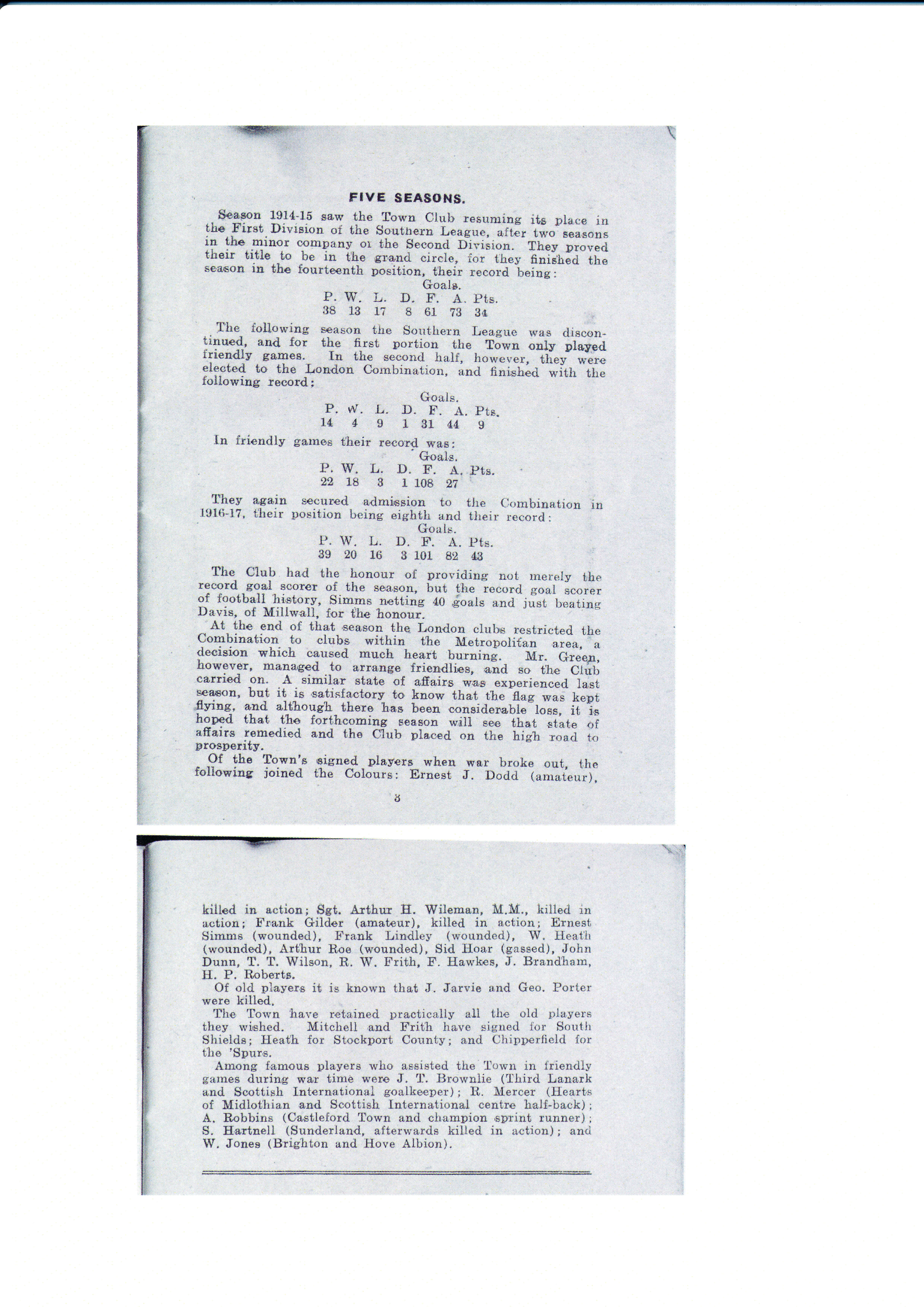 The handbook includes a review of Luton Town's 1914-15 season in the Southern League and the 1916-17 season in the Combination league. It also lists the Luton Town players who served in the Army during the War and those who were killed or wounded.