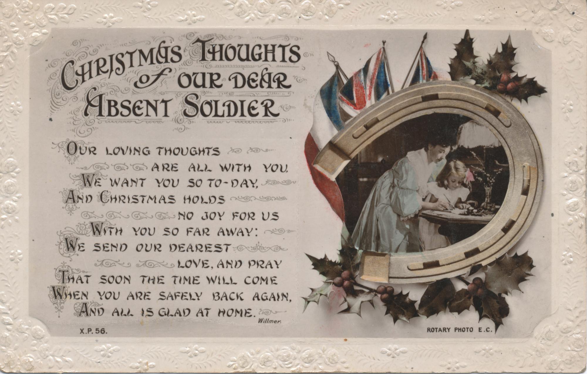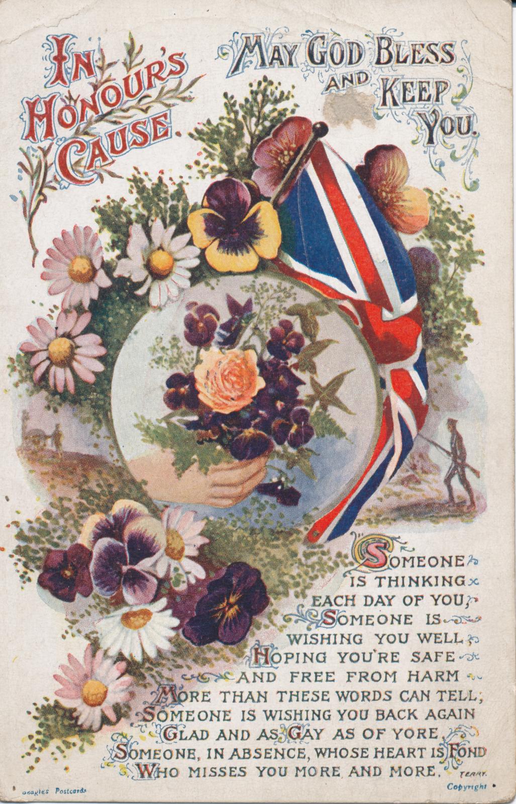 During the Great War, sending, receiving and collecting picture postcards was hugely popular. Many commercial outlets produced postcards with patriotic messages. Images  of soldiers and their families with sentimental verses were also common. These cards were eagerly bought by the public to send to relatives on active service.