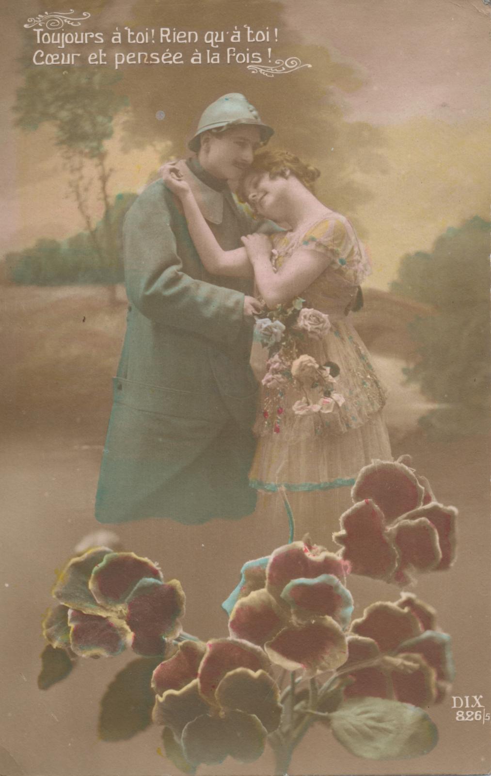 Sending, receiving and collecting picture postcards was very popular in the Great War. Many soldiers on active service on the Western Front would buy postcards in local shops as souvenirs or to send home to loved ones. The subject matter was usually romantic and sentimental.
